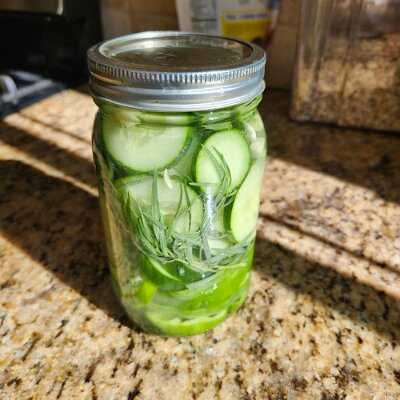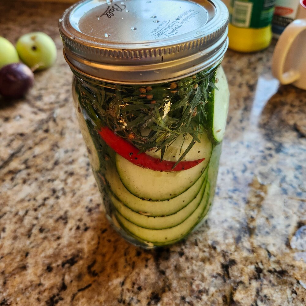 Added 2 long cucumbers and a couple radishes to a 1qt mason jar as seen below.